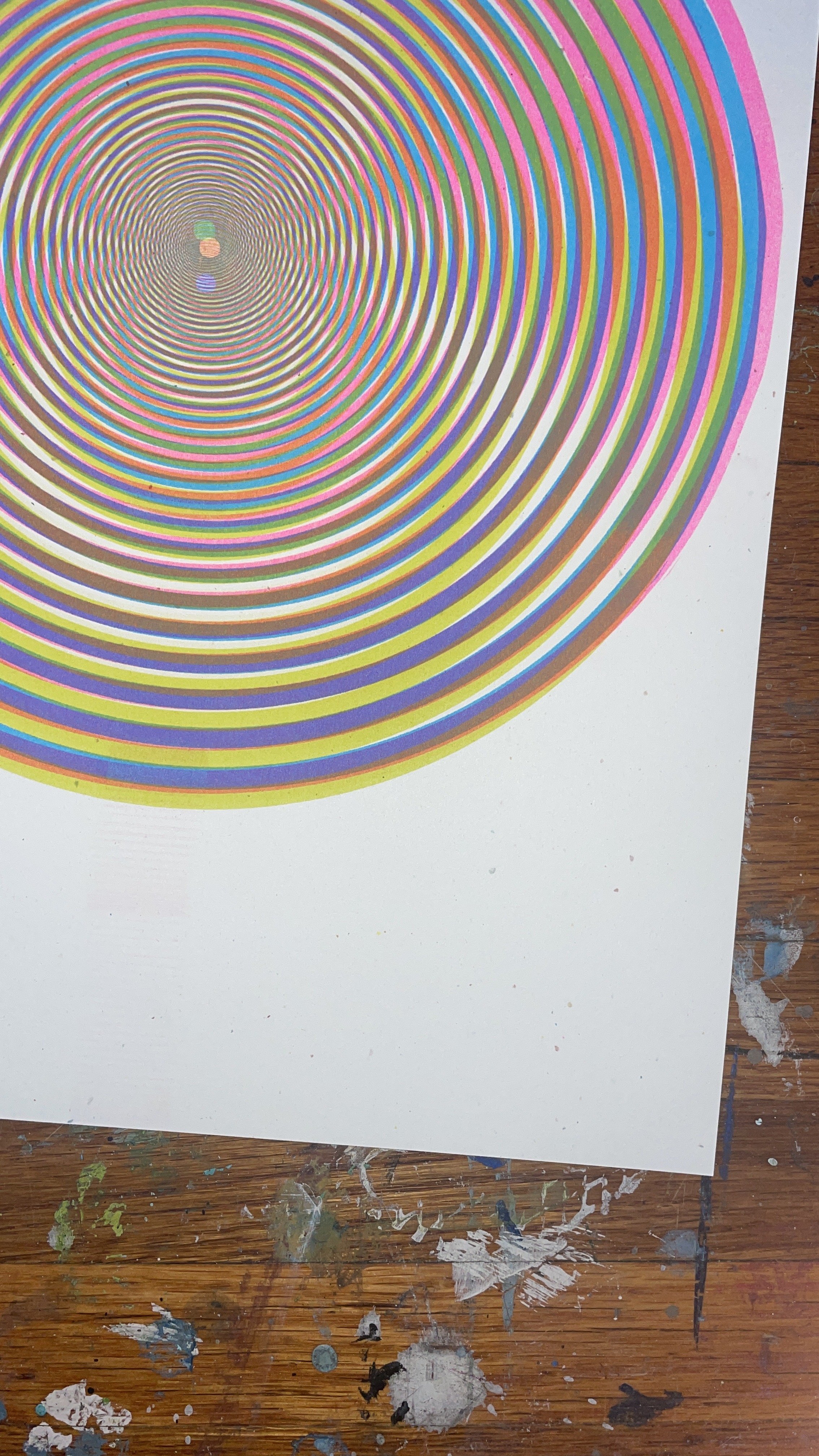 Made on the risograph duplicator, each vortex print was nudged over / up / down between prints resulting in a collection of 20x originals with unique interference patterns printed on Astrobrights Stardust White Cardstock